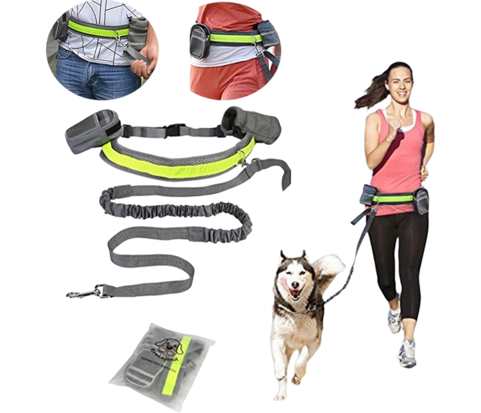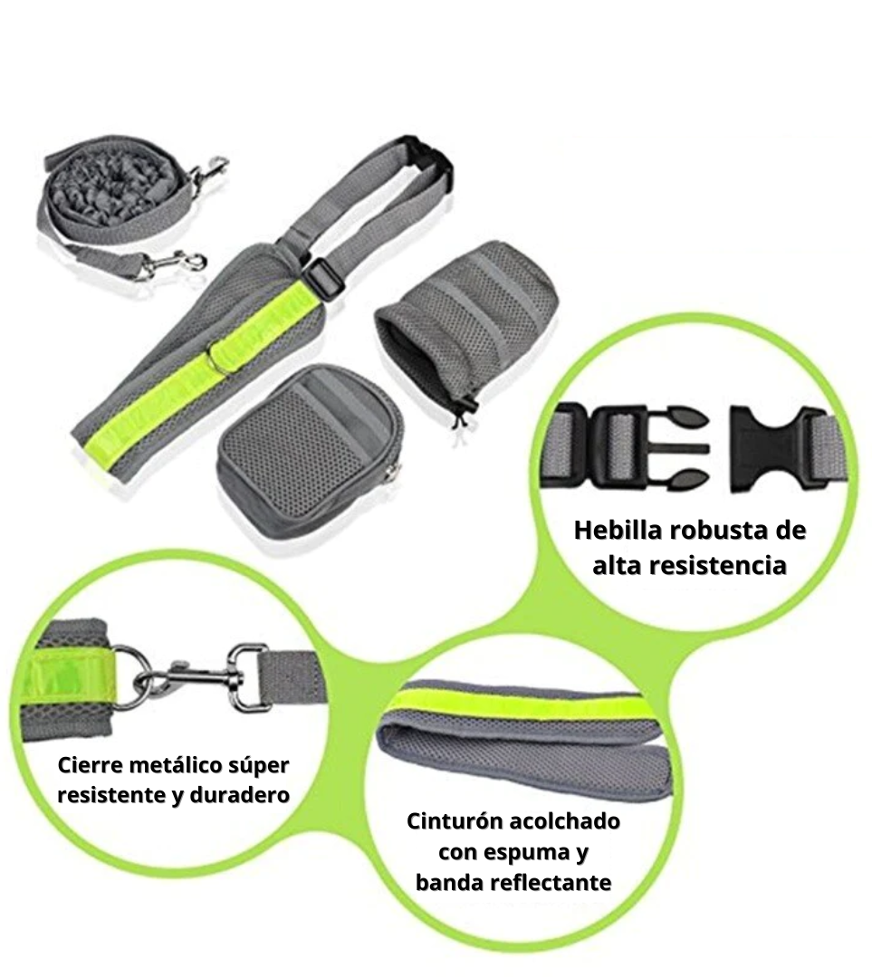 Esta correa manos libres se ajusta a tu cintura y absorbe los tirones — para que caminar, correr o pasear sea cómodo, seguro y 0 estrés.